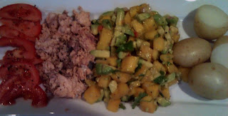 Plan C - 2 nights worth of mango and avocado salsa became the mainstay of the meal, accompanied by a can of rather bland salmon - but the chilli needed something bland. :) And potatoes which of course had been prepared in readiness for the lamb! A slightly odd meal perhaps, but the salsa was devine. Albeit a rather firey kind of devine. :)