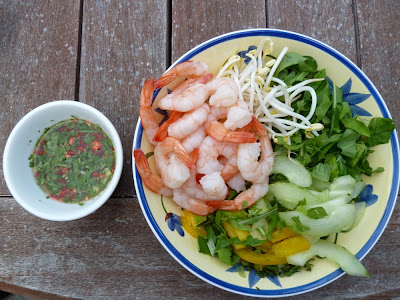 Top the vermicilli with the prepared salad ingredients, plus the mung beans & prawns, leaving the diner to mix their own salad.