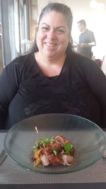 For our mains, I had the "Smoked lamb loin, gremolata, goats curd, eggplant, artichoke heart, puffed black rice" and Jane had the "Glazed duck, soft shell crab, pomegranate, cucumber, coriander, vanilla lime dressing". Both were yet again superb, but my taste of Jane's dish was absolutely divine. We accompanied the mains with a nice "green leaf, walnut, pear, white balsamic" salad. I had the 2013 Elephant Hill Reserve Syrah and this was superb.