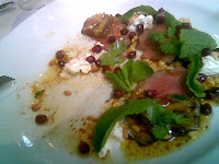 • Entree (Shared): Rare beef salad with pomegranate, pine nuts, fresh mint, dates - TO DIE FOR! I literally savoured every single mouthful of this. Wow. Oh - and it was an attractive dish as well! (see sneaky cell phone pic - not quite so attractive as we'd devoured half of this before I remembered to take a photo. But it was beautifully presented.)