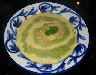 The Brocolli is warm (intentionally) and served with (again, my take on an inspiration from Jane G) a greek dressing called Lemonolatha. This had olive oil, dill, spring onions, white wine vinegar (this was mean to be the lemon - but I couldn't find any - until I opened the fridge after I'd made this! Bother! Next time). More garlic and the judicious use of my trusty blender. Again, I was quite pleased with the result on this one too - and I have a little pottle of the dressing left over in the fridge for later in the week. Apparently this is a dressing which is traditionally served over warm vegetables.