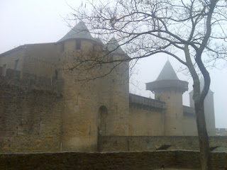 Yesterday we jumped on a train and meandered (hmm, not quite an appropriate term given how fast the trains are here) towards the coast, through Sete, Narbonne and another place I can't remmber and then inland to Carcassone. The weather was truely vile, completely misty and catching a glimpse of La Cite from the train as we approached was not to be. In fact, even walking through town, it was some distance before we caught our first ghostly glance of the city on the hill.