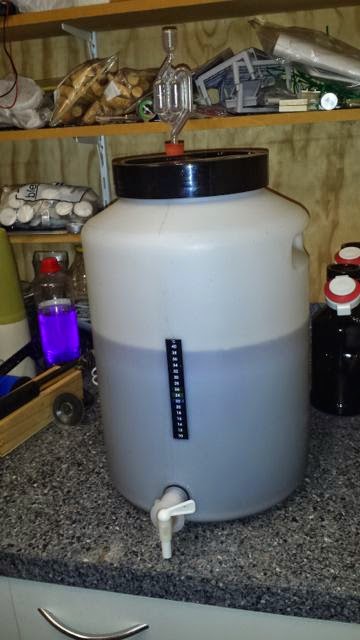 With the help of Jane, we then strained the wort into a cleaned and sterilised fermenter. The wort in the pot was very heavy and it was quite a struggle. I suspect I should look at syphoning for future brews. I then took a hydrometer reading (1.06 OG) and added some rehydrated Safale US-05 yeast. The resulting brew was about 16.5 litres (from the 26 litre starting point. The resting temperature was initially 24 degrees Celsius, but it has already dropped to 23 degrees and should come down overnight (18-20 is where I tend to like it) and hopefully the fermentation will start tomorrow. All going well, I should be bottling in 2-3 weeks.