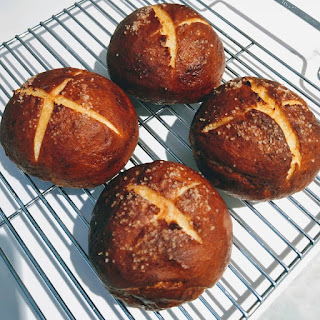 Don't be fooled by the date and the look of these - they are not hot cross buns!!! But they're hot buns with crosses in them and they're damn tasty! Bretzel buns! There are so many variations on how to make these guys, I ended up devising my own recipe after reading/watching at least 4 that had a variety of commonalities and deviances. My recipe doesn't use milk - we typically don't have any the house, and seeing as I found other recipes without milk I figured I'd get away with it. I definitely did!
